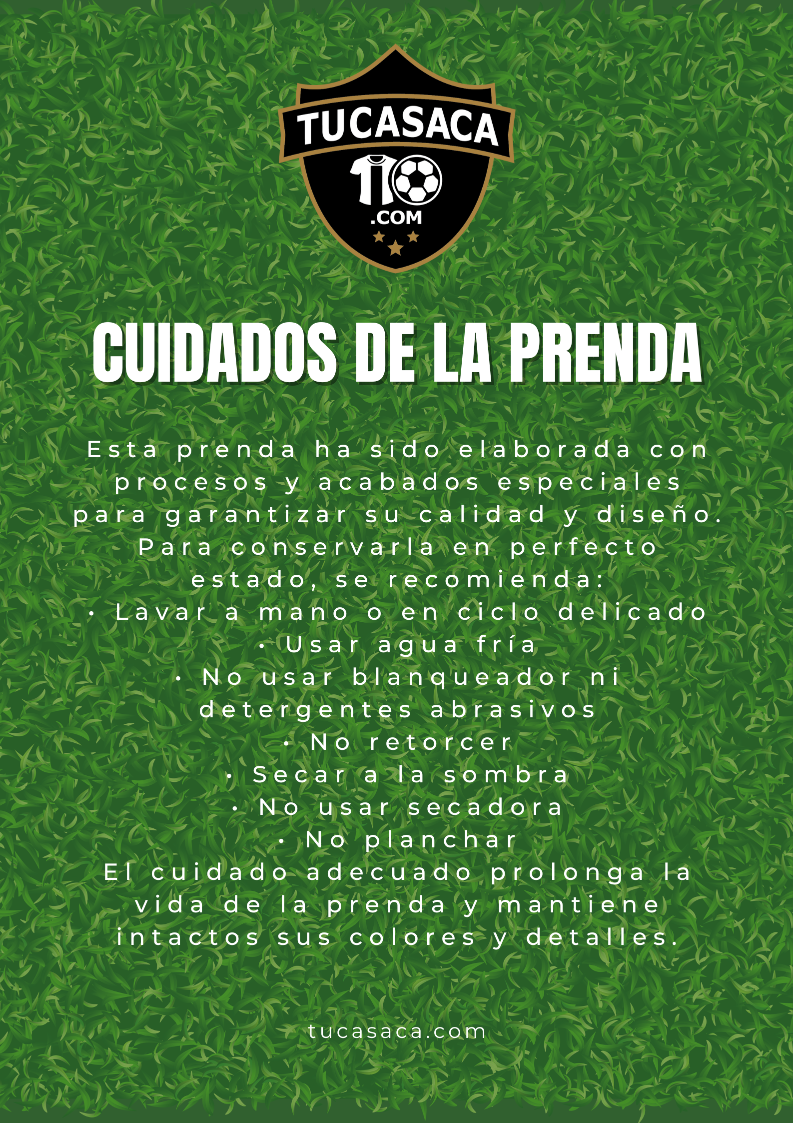 Nuestras casacas no son una prenda cualquiera. Muchas están elaboradas con telas delicadas, estampados, dorsales, escudos, bordados, parches o acabados que requieren un cuidado especial para conservar su apariencia, su estructura y su durabilidad con el paso del tiempo.